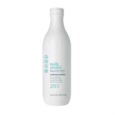 Emulsión oxidante formulada para aclarar bases natural hasta 3 niveles y cubre las canas con maridaje con milk_shake® beyond light.